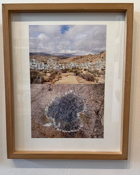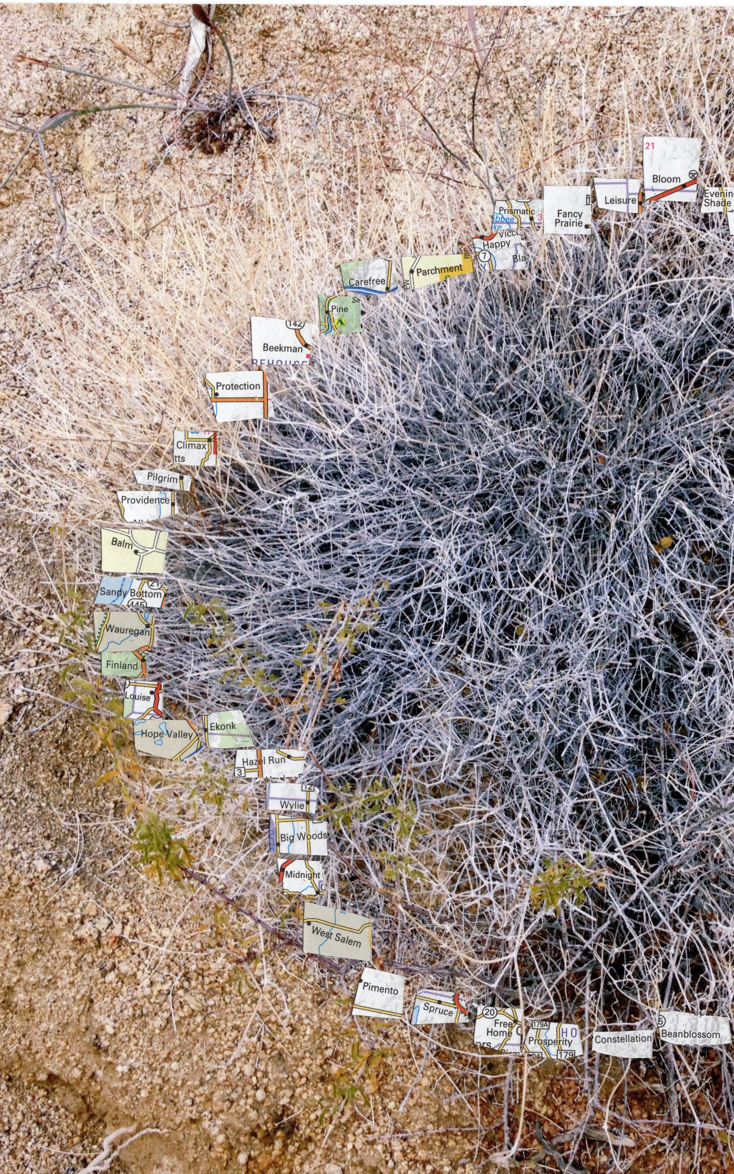 I created this image Town Totem: Desert Spell while caring for a loved one and unable to travel. I turned to an old atlas, cutting out town names that stirred memories or made me smile. The towns came alive, connecting me to real and imagined places, forming fictional monuments on my Joshua Tree photographs.